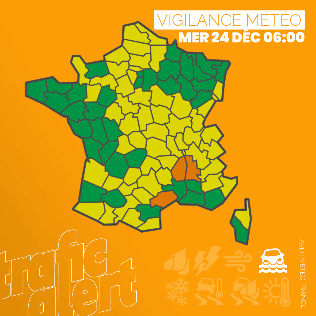 Hérault revient en vigilance orange pour crues, vallée du Rhône pour neige, possibles pluies verglaçantes la nuit prochaine.